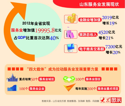 11月1日,省政府辦公廳下發《山東省人民政府關于加快服務業發展的若干意見》,共30條,提出通過加強引導、增加投入、簡政放權、優化環境、激勵創業、推動創新、強化考核等一系列舉措,助推服務業改革發展,力爭到2020年,服務業增加值占生產總值比重達到50%左右,基本形成服務業占主導地位的經濟結構。