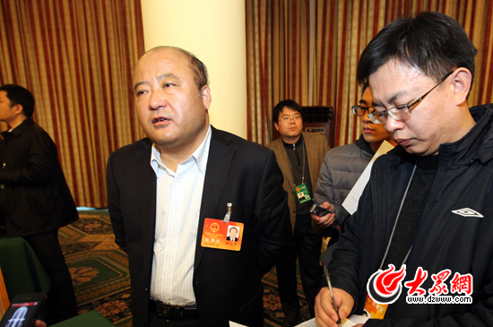 省人大代表、臨沂市委書(shū)記張少軍(左)接受大眾網(wǎng)記者采訪。(盛堃 攝)