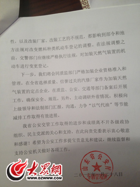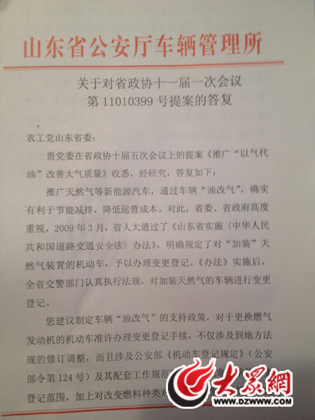 大眾網濟南1月29日訊(記者 王磊)今天,我省部分地區又遭霧霾天氣。在省政協十一屆一次會議上,十一屆省政協委員王倫善建議,在全省城鎮進一步加大推廣“以氣代油”力度,以降低 PM2.5排放。今天下午,省公安廳車輛管理所有關負責人向其當面回復稱,私家車在指定廠家加裝“油改氣”設備的,交警部門按有關規定,對“加裝”天然氣裝置的機動車,予以辦理變更登記,但“以氣代油”尚待相關法規調整。