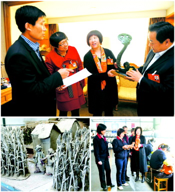 上 圖 駐地賓館房間里,譚宏偉(右二)新設計的作品,引起代表們對政府工作報告中有關“加快文化強省建設”內容的討論。