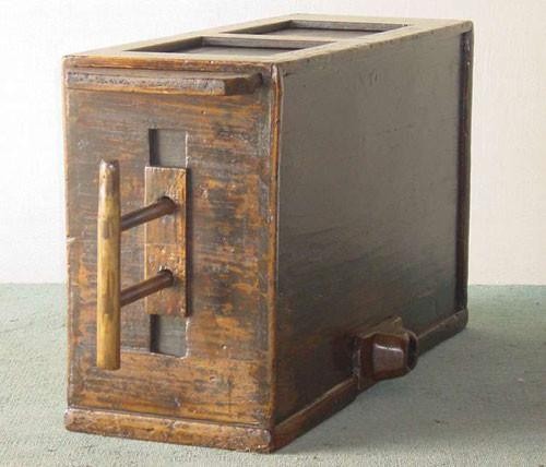 風箱起源于古代冶鐵技術,是冶煉技術中必不可少的鼓風設備。最好的風箱應該是柳木箱、棗木桿,做風箱必須用柳木,因為柳木不但有彈性,而且性軟,不裂,耐磨。桿的作用是牽動“貓耳頭”,所謂“貓耳頭”,就是“活塞”,是一塊立在箱內可以來回活動的長方形夾板。為了不漏氣,風箱扇兒的大小尺寸,幾乎就和風箱的內腔差不多大,四周還要用牛筋繩緊緊地箍著一圈雞毛。軟軟的雞毛既不影響風箱扇兒的推拉,又能起到密閉的作用;铋T共兩個,前后各一個,很小,掛在窗口上,吸風時能張開,推風時能合緊,把產生的氣流壓向一隅,然后通過風道送出去。風道在箱底一側,俗話叫它“老鼠洞”,方型,兩端留有風口。