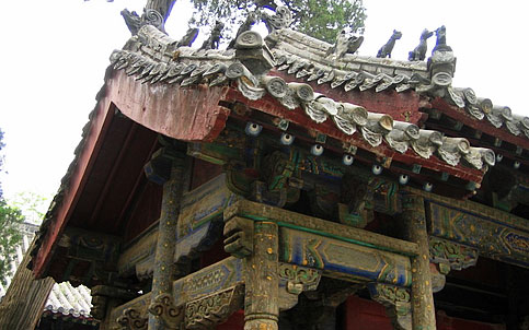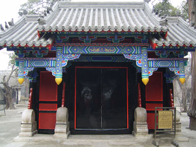 孔府位于曲阜城的中心,坐北朝南,迎面是一個粉白的大照壁,門前左右兩側(cè),有一對2米多高的圓雕雌雄石獅。紅邊黑漆的大門上鑲嵌著狻猊鋪首,大門正中上方的高懸著藍底金字的“圣府”匾額,門兩旁明柱上,懸掛著一對藍底金字對聯(lián):與國咸休安富尊榮公府第,同天并老文章道德圣人家。這副對聯(lián)相傳是清人紀均的手書。文佳字美,形象地說明了孔府在封建社會中的顯赫地位。這副對聯(lián)口氣之大自不待言,發(fā)人深思的是上聯(lián)“安富尊榮”的富字,下聯(lián)“文章道德”的章字,從上圖可以看出,“富”字上少了一 點,“章”字中多了一筆,意思是說衍圣公官職位列一品,田地萬畝千頃,自然富貴沒了頂;孔子及其學說“德侔天地、道冠古今”,圣人之家的“禮樂法度”,也就能天地并存,日月同光。