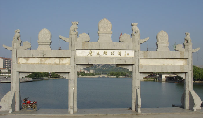 湖中間建一石拱橋,總長75米,名日“觀景橋”,立于橋頂,四下了望,波光瀲滟,畫航迢遞,游人絡繹,荷花芬芳四溢,笙歌悠悠傳情;湖岸垂柳依依,鳥鳴囀囀;路邊花池密植月季、紅芍、海棠、丹桂、冬青等奇花異草,攀名逐貴,爭奇斗艷。