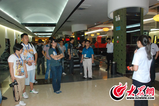 全民健身活動(dòng)中心的工作人員向采訪團(tuán)介紹情況。 記者 郭豪 攝