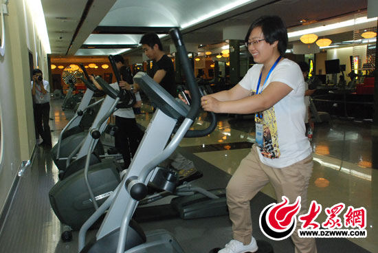 在體育公園全民健身活動(dòng)中心內(nèi),采訪團(tuán)記者體驗(yàn)健身運(yùn)動(dòng)器材。記者 郭豪 攝