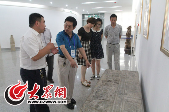 工作人員向記者們介紹,這塊在巨野出土的石碑源于明末清初,碑上刻著麒麟,這與“麒麟降于巨野”的傳說相契合。(記者 郭豪 攝)