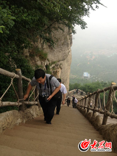 18日,記者們攀爬成70度的天梯,到達天上王城頂部。(大眾網記者李兆輝 攝)