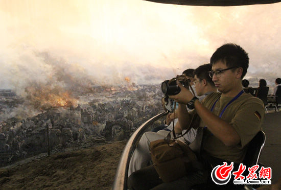 在全景畫館內(nèi),采訪團(tuán)記者們被逼真的全景效果所吸引,目不轉(zhuǎn)睛的盯著眼前的畫卷,有的記者激動地握起了拳頭。來自東北新聞網(wǎng)的記者李月熒表示,在這里得到了真正的“紅色文化”教育。
