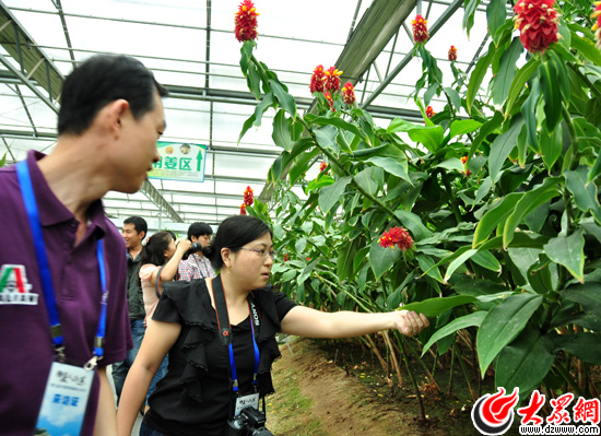 南線采訪團記者對觀賞姜花很感興趣。(大眾網(wǎng)記者 熊戈措 攝)