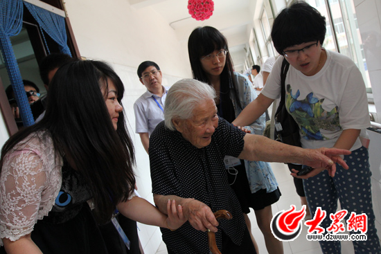 記者們攙扶老奶奶回房休息。大眾網記者 馬鑫 攝