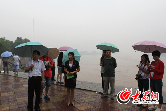 記者們在雨中參觀黃河綠色長廊。大眾網記者 馬鑫 攝