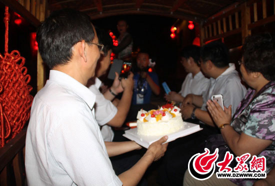 大眾網(wǎng)棗莊6月21日訊(記者 郭豪 赫洋 呂斌)“Happy birthday to you,Happy birthday to you……”今天晚上,“聚焦美麗山東—中國網(wǎng)絡(luò)媒體山東行”西線采訪團(tuán)在臺兒莊古城登船夜游采訪,6位在本月生日的采訪團(tuán)成員驚喜地獲得了會務(wù)組精心準(zhǔn)備的奶油蛋糕,在游船上在夜色里,大家共同度過一個(gè)歡樂、愜意的夜晚。