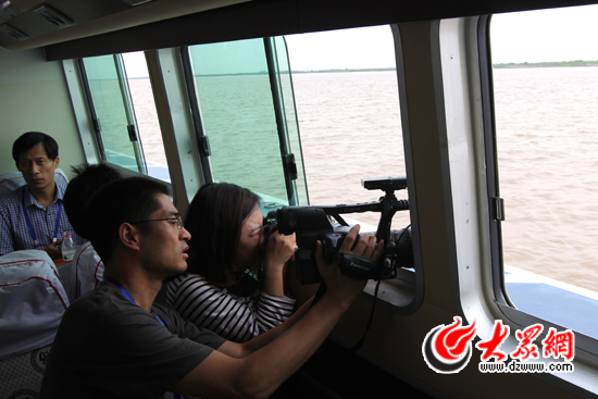采訪團記者們在船上近距離拍攝黃河。大眾網記者 馬鑫 攝