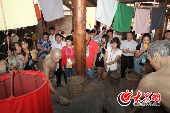 記者們在“大染坊”內了解周村百年前的染布工藝。