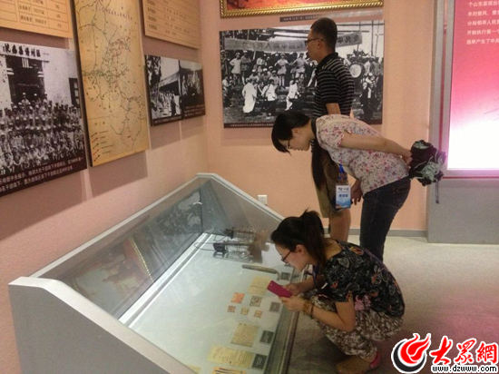 19日,“聚焦美麗山東-第九屆中國網(wǎng)絡(luò)媒體山東行”南線采訪團(tuán)來到了莒南八路軍115師司令部中共山東分局、山東省政府誕生地。圖為媒體記者在觀看革命年代留下的珍貴資料。(大眾網(wǎng)記者 李兆輝攝)