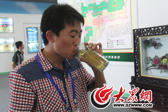 中華泰山網(wǎng)的記者王磊品嘗牡丹茶后,連說“好喝”。 記者 郭豪 攝