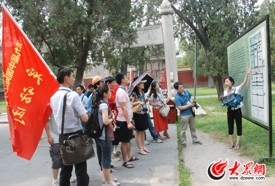 今天上午,天氣雖然比較炎熱,但一點也擋不住記者們的參觀和采訪熱情。在萬仞宮墻、金聲玉振牌樓前,大家一邊認真聽講解一邊隨手用筆記錄,隨后再用相機、攝像機記錄下所見所聞。