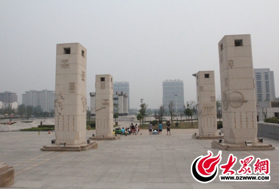 奚仲廣場內的浮雕石柱。 記者 郭豪 攝