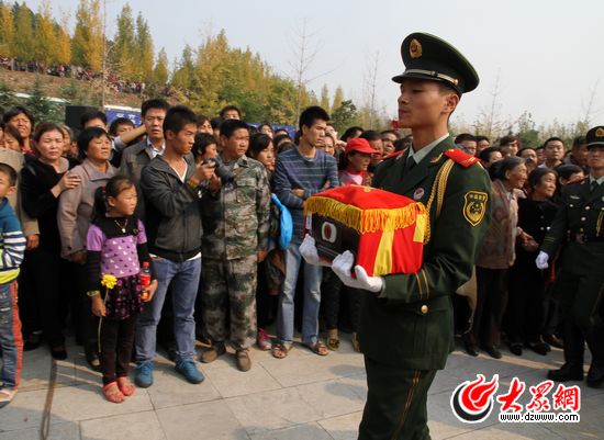 在劉洪坤烈士家鄉(xiāng)界河鎮(zhèn)二十里鋪村,靈車還未入村,附近村及二十里鋪村村民早早就在村口等候,當靈車開進村口,鼓樂齊鳴,“嘭”一聲炮響,震懾天地,劉洪坤的鄉(xiāng)親鄰里用最傳統(tǒng)的方式與車同行,和烈士劉洪坤一起,走一趟“回家”的路。繞行一周后,在村民的注目下,劉洪坤的骨灰被送往滕州市烈士陵園。