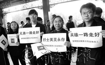 首鋼園區(qū)服務公司職員舉著自制的悼詞牌,向兩位英雄告別。