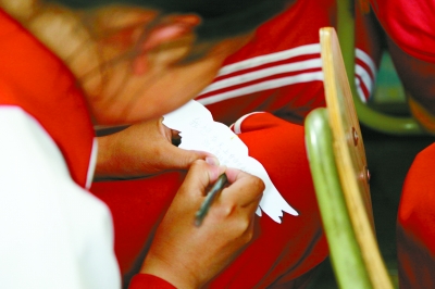 圖九:劇組向老峪溝中心小學的孩子們征集夢想,孩子們正在夢想卡片上認真地寫上自己的夢想。