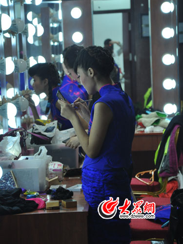 演員正在后臺忙碌地化妝準備登臺演出