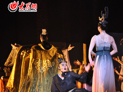 上半場,在曹植第一次見到甄氏時,圓月格外皎潔,甄氏撥動的琴弦鳴響在曹植的心中,使人們忽然產生了飄離呻吟與哭叫的戰火,升騰到和平生活本該有的那種夢境的感覺,高潔,清雅,伴隨著矛盾升級,音樂的舒緩變為急湊,聲勢浩大的傳統鼓舞搬上了舞臺,曹丕和曹植在鼓樂下激烈對舞,高潮迭起,讓人為他們捏了一把汗。