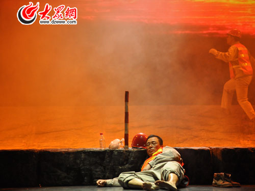 大眾網(wǎng)煙臺(tái)10月16日訊 (記者 鐘建) 在電閃雷鳴、暴雨傾盆的夜晚,剛剛獻(xiàn)完血,已經(jīng)連續(xù)工作15個(gè)小時(shí)的郭明義出現(xiàn)在了搶修礦山公路的搶險(xiǎn)現(xiàn)場(chǎng)……16日晚7時(shí)30分,根據(jù)郭明義事跡改編創(chuàng)作、由遼寧人民藝術(shù)劇院創(chuàng)作排演的現(xiàn)實(shí)主義話劇《郭明義》在煙臺(tái)廣電大劇院上演。
