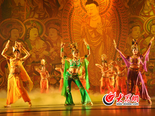 天山、昆侖山、天池、烏拉泊古城、千佛洞、胡楊、婚禮等等人們熟悉的地方、景觀、民族風俗、歷史故事紛紛上演。演出中,編導調動各種藝術手段,將“繡花氈”、“木臼舞”、“馬鞭舞”、“戲水梳妝舞”等新疆特有的民族民間文化展現在舞臺上,同時,演員們華麗多彩的服飾,精美的頭飾等也向觀眾展示了新疆民俗服飾的美麗。