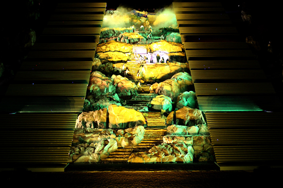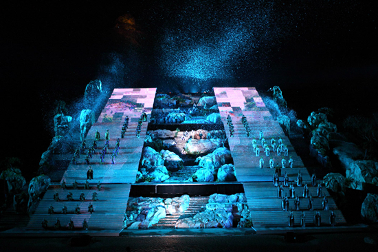 《中華泰山·封禪大典》以泰山山水為背景,結(jié)合現(xiàn)代燈光效果,美輪美奐