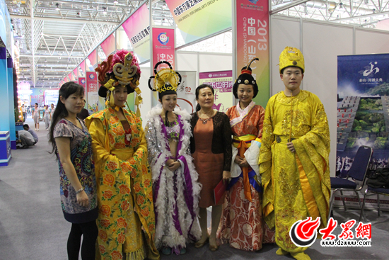 《中華泰山·封禪大典》的“皇家組合”受到參展客商的歡迎,大家紛紛與他們合影 記者 馬俊驥 攝