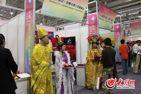 在今天上午開(kāi)幕的“十藝節(jié)”中國(guó)(山東)演藝產(chǎn)品交易會(huì)上,一隊(duì)“皇家組合”引來(lái)眾多目光。四名演員身穿宮廷服飾,推介《中華泰山·封禪大典》演出項(xiàng)目,讓不少人笑稱(chēng):“唐高宗和武則天來(lái)‘十藝節(jié)’了。”