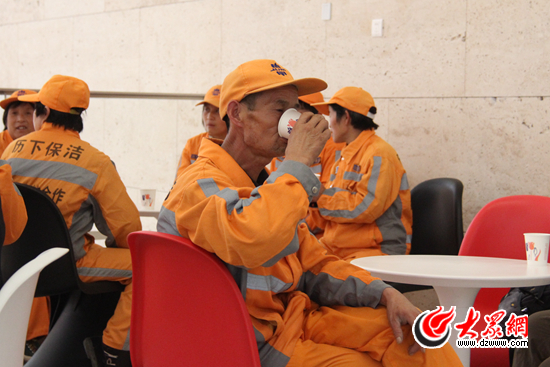 看完畫展后,環(huán)衛(wèi)工人們在咖啡吧休息、免費飲水 記者 馬俊驥 攝