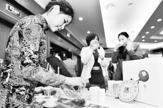10月16日,“古道丹青 墨韻普洱”舒建新中國畫展新聞發布會現場,參會人員在品嘗地道云南普洱茶。 □王世翔 報道