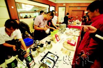 舒建新中國畫展新聞發布會后,與會者參觀普洱咖啡的沖泡過程! ”緢笥浾摺〈鱾ァz