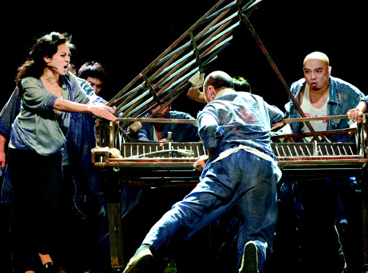 音樂(lè)劇《鋼的琴》根據(jù)2011年國(guó)產(chǎn)電影口碑第一的《鋼的琴》改編而成,匯集了著名音樂(lè)人三寶、編劇關(guān)山等主創(chuàng)人員,于2012年10月24日在廣東省東莞玉蘭大劇院首演。故事描述的是一部現(xiàn)實(shí)題材非常“接地氣”的小人物生活:在“誰(shuí)能給喜歡音樂(lè)的女兒買一架鋼琴,女兒就歸誰(shuí)”的邏輯下,一位窮困潦倒的父親陳桂林為了爭(zhēng)奪女兒的撫養(yǎng)權(quán),毅然決定在一個(gè)瀕臨破產(chǎn)的鋼鐵廠里造一架“鋼的琴”,“在沒(méi)有英雄的年代里,我只想做一個(gè)父親”,展現(xiàn)了陳桂林和工友們面對(duì)困境的頑強(qiáng)斗志,而這也正是三寶、關(guān)山這對(duì)“中國(guó)音樂(lè)劇黃金組合”這些年來(lái)所專注的音樂(lè)劇類型,“我們的音樂(lè)劇一定是致力于現(xiàn)實(shí)題材的,只有跟現(xiàn)實(shí)發(fā)生關(guān)聯(lián)才是真正有意義的,能夠打動(dòng)人心的,不是才子佳人、輕歌曼舞,而是劇中這幫看起來(lái)有些‘二’的工人們表現(xiàn)出來(lái)的笨拙的、鈍的、夯實(shí)的力量。”