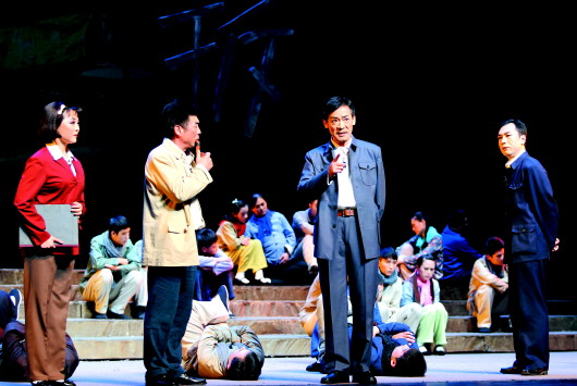 渾厚的伴唱聲,精彩的舞臺呈現(xiàn),動人的感人場面,深刻的精神內(nèi)涵——《百姓書記》這出新創(chuàng)作的現(xiàn)代呂劇給我留下了極為深刻的印象。這是少有的把政治宣傳題材做成藝術精品的好劇目。自從2011年山東省呂劇院帶著這出戲來北京,參加文化部舉辦的“慶祝建黨90周年——全國現(xiàn)代戲優(yōu)秀劇目展演”到現(xiàn)在,這出戲歷經(jīng)三次大的修改,在100多場的演出中日臻成熟,并成為“十藝節(jié)”開幕式演出劇目,這足以看出山東省呂劇院全體演職員的努力拼搏精神、藝術追求,為社會、為人民奉獻好的精品力作的社會責任感。