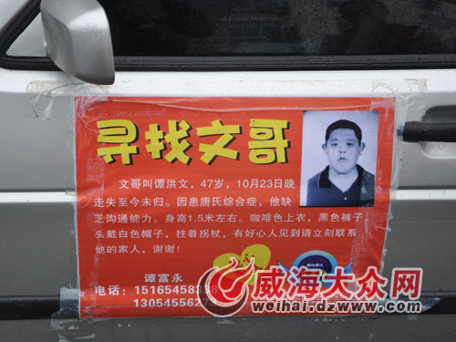 “文哥”,全名為譚洪文,男,47歲。家住煙臺市三馬路民生街34-1號。身患先天性智能低下,有糖尿病。身高約150cm左右。走時身穿深咖啡色上衣,黑色褲子,頭戴通用型白帽子,拄著拐棍,黑色鞋子。于10月23日晚飯后外出至今未歸。
