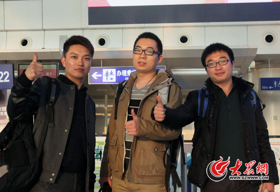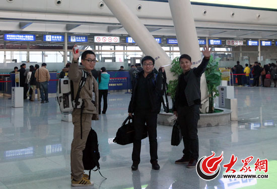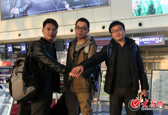 大眾網3名特派記者尹海洋、盛堃、李兆輝(自左至右)準備登機飛赴四川