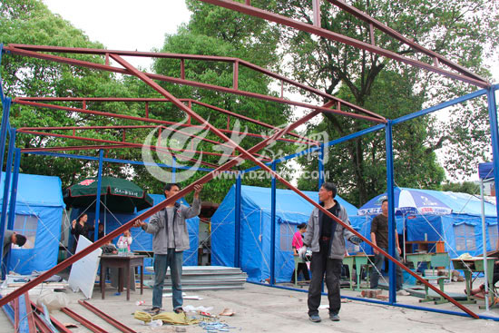 一路上,五個(gè)人輪流開車、吃飯,除了上廁所,卡車幾乎沒有停下過。終于,4月23日下午,劉志剛趕到了蘆山縣,在跟政府部門協(xié)調(diào)后,他們將板材拉進(jìn)了蘆陽鎮(zhèn)第二小學(xué)。下午7點(diǎn)多,弟兄五人匆匆吃過“午飯”后,便開始搭建活動(dòng)板房。