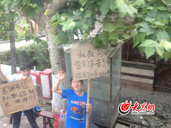 在蘆山縣城郊道路上,隨處可見打著感謝標語的孩童。大眾網(wǎng)特派記者 攝