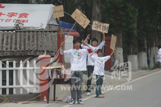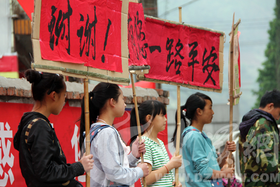 沿途到處是舉著感謝標語的災(zāi)區(qū)群眾。大眾網(wǎng)特派記者 攝