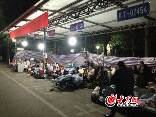 21日凌晨3點,大眾網(wǎng)記者趕到雅安市人民醫(yī)院。大眾網(wǎng)記者看到,該院院內(nèi)已經(jīng)搭建起收治病人的臨時帳篷。為了給地震中受傷的百姓騰出床位,不少病情較輕的病人被轉(zhuǎn)移到臨時帳篷內(nèi)。