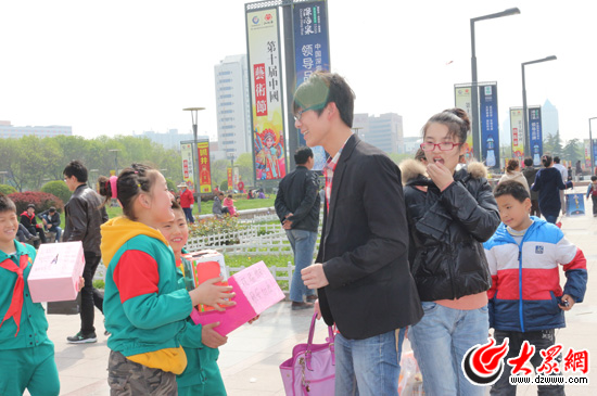 “叔叔、阿姨,給雅安震區的同胞們獻一份愛心吧。”今天下午1點,在濟南泉城廣場,20多個手捧自制募捐箱的小學生掀起了一場援助震區的愛心熱潮。不到一個小時,300余名路人伸出援手,加上孩子們自己捐出的零花錢,他們將1500余枚硬幣、600余張紙幣共計3524.1元善款送到了大眾網編輯部。