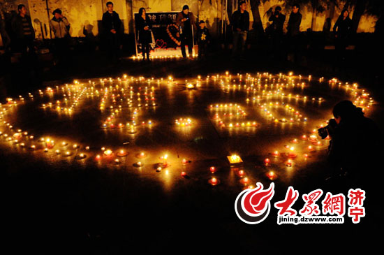 23日晚上,鄒城部分市民自覺組織在人民廣場上,他們有的領(lǐng)著孩子,有的拿著剛買來的蠟燭,有的獻出火機,不一會就用蠟燭點燃起來一個心形圖案,心形畫面里用蠟燭擺著《雅安,4,20》,愛心人士手捧蠟燭,牽手默哀祝福,參與本次活動大約100多人,場面感人。