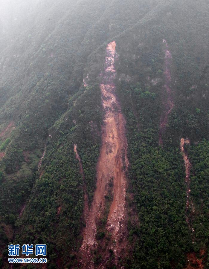 這是4月21日在寶興縣上空拍攝的發生滑坡的山體。 4月21日,成都軍區某陸航旅直升飛機運送40名國家地震災害緊急救援隊隊員進入寶興縣。記者隨機搭乘,從空中拍攝了蘆山縣、寶興縣等受災地區的照片。新華社記者 李剛 攝