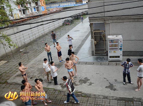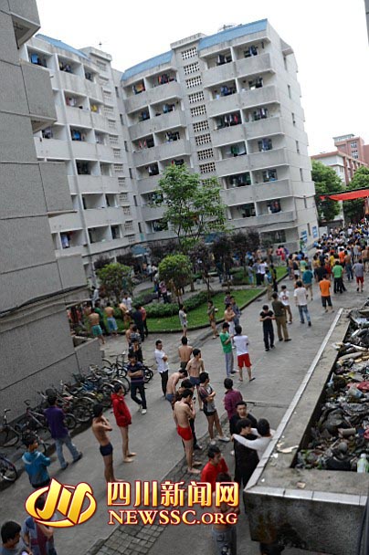 08:02分,記者正在成都市一環路菊樂路口某高校內,感覺到強烈搖晃。記者看到,很多學生光著身子從宿舍往下跑。據成都體育學院學生王彬介紹,當時宿舍里的床鋪左右強烈搖晃10到15秒。