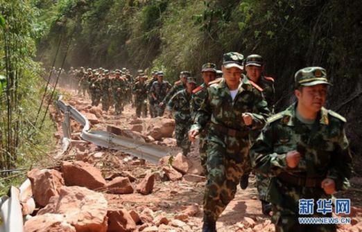 4月20日,因地震造成山體滑坡,道路受阻,救援人員徒步趕往救援現場。記者剛剛從四川省地震局獲悉,截至20日16時40分,雅安蘆山地震已造成四川113人死亡。具體傷亡人數仍在進一步統計中。 新華社記者陳燮 攝