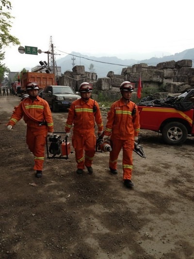 一名雅安籍消防戰士含淚奮戰在搶險救援一線