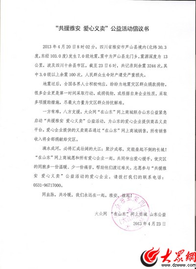 網(wǎng)絡(luò)愛心大接力,用愛溫暖一座城。今天起,大眾網(wǎng)“在山東”網(wǎng)上商城聯(lián)合山東公益正式啟動“共援雅安 愛心義賣”公益活動,愛心企業(yè)提供的義賣商品通過“在山東”網(wǎng)上商城銷售,所有銷售收入將全部捐獻(xiàn)給災(zāi)區(qū)。